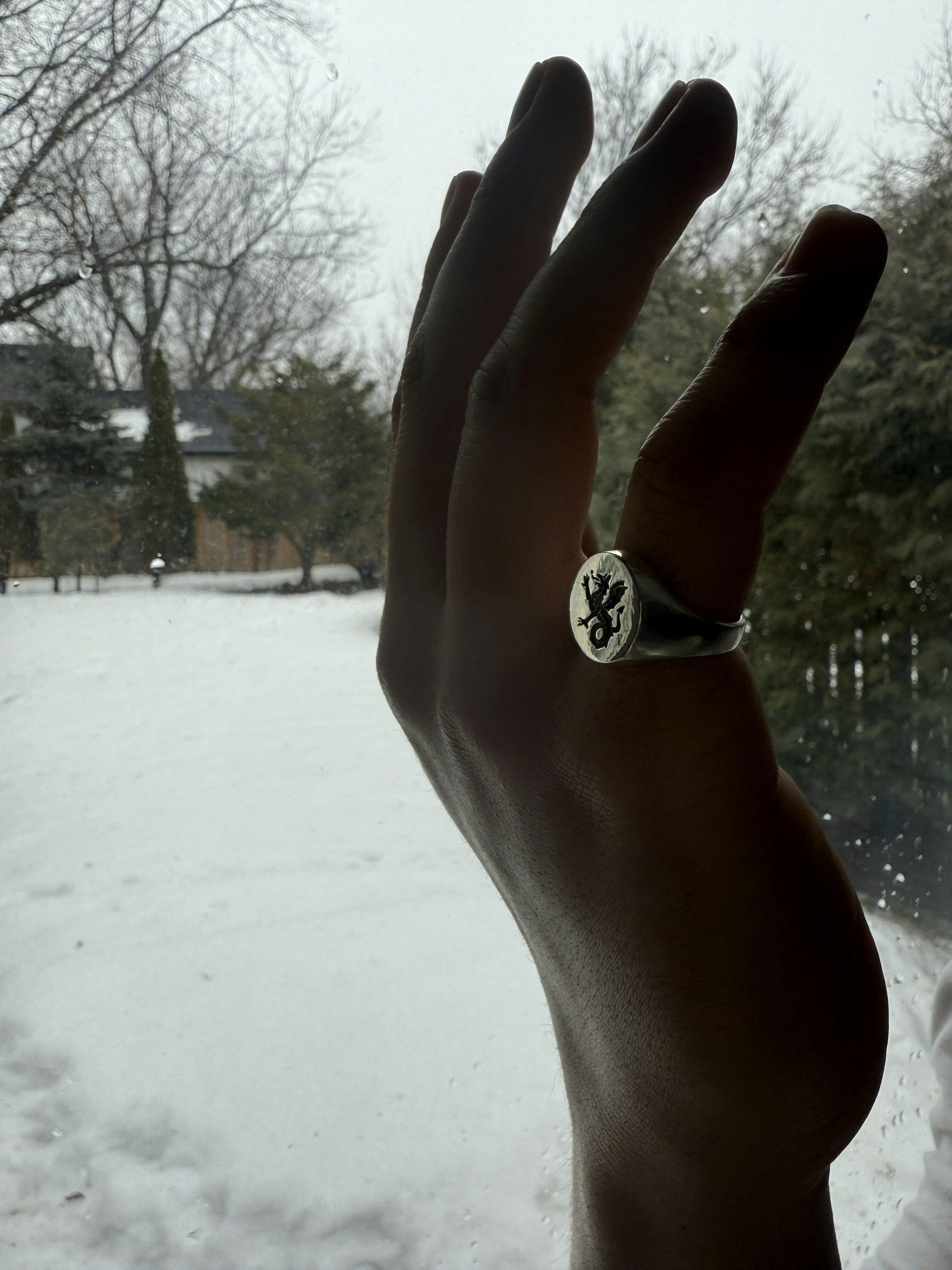 The inspiration for this piece came from a story my uncle once told me about a family heirloom lost many generations ago. A signet ring with the heraldry of a wyvern on it, which has now become a symbol of Eldridge Jewelry.
